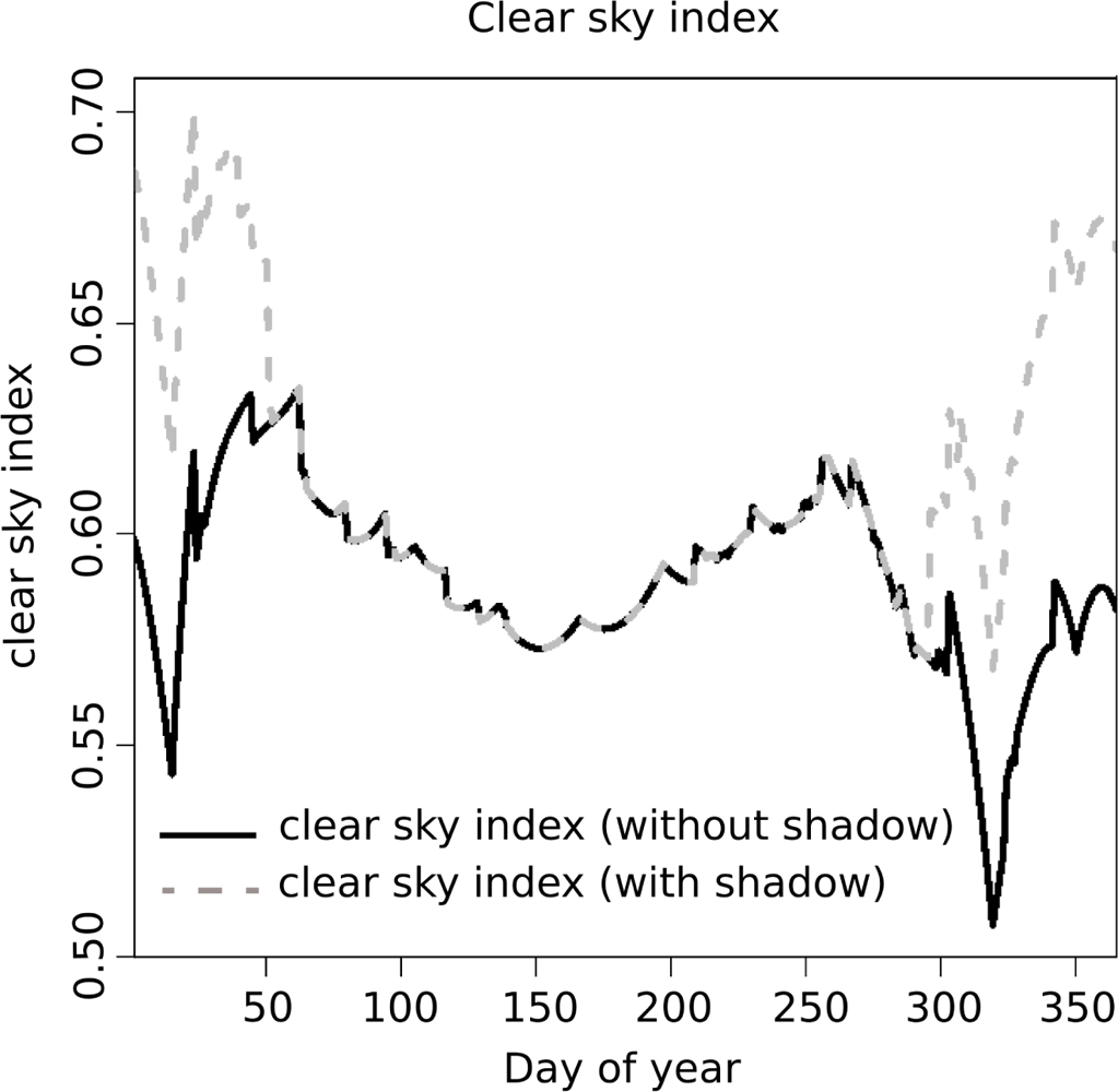 The clear sky index over the course of the year. The dashed grey line shows the clear sky index by respecting the shadows of the DTM. The black line does not include any shadows.