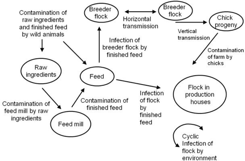 Feed has been implicated as an important source of Salmonella to poultry [18,19]. Hinton [20] demonstrated that Salmonella infection could become established in day old chicks fed 0.1 to 0.3 cells of Salmonella per gram of feed. Modern culturing techniques require enrichment in order to detect such a low number of cells and molecular techniques are not sensitive enough to detect such low numbers. For this reason, some Salmonella contamination of feed may pass undetected. Sources of Salmonella and the processing of feed will be discussed in the next section.