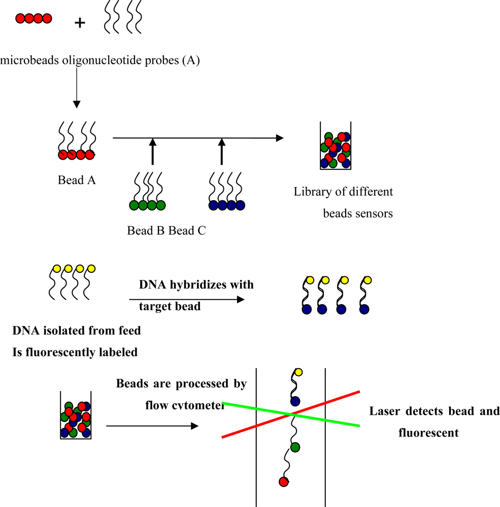 Bead-based DNA arrays have several advantages over planar microarrays; (1) they can accommodate standard 96-well sample preparation systems; (2) since probes are coupled to distinct microspheres, each hybridization reaction can be analyzed; (3) if an additional target has to be included into the assay, a new type of probe-loaded bead can simply be added to the array unlike planar microarrays which require the new fabrication of arrays to add a target [68,69]. Bead-based arrays coupled with flow cytometry technology have been successfully applied for the simultaneous detection of multiple bacterial pathogens [71]; however this study was done with pure culture of target pathogens. Bead-based arrays have never been employed for detection of pathogens in more complex matrices such as feed or environmental samples. Bead-based arrays have been more commonly used in clinical applications such as simultaneous quantification of cytokines or autoantibodies from biological samples [72–75]. Bead-based arrays have the great potential for rapid and sensitive identification of Salmonella from feed. The criteria for optimal bead based array design are listed in Table 1.