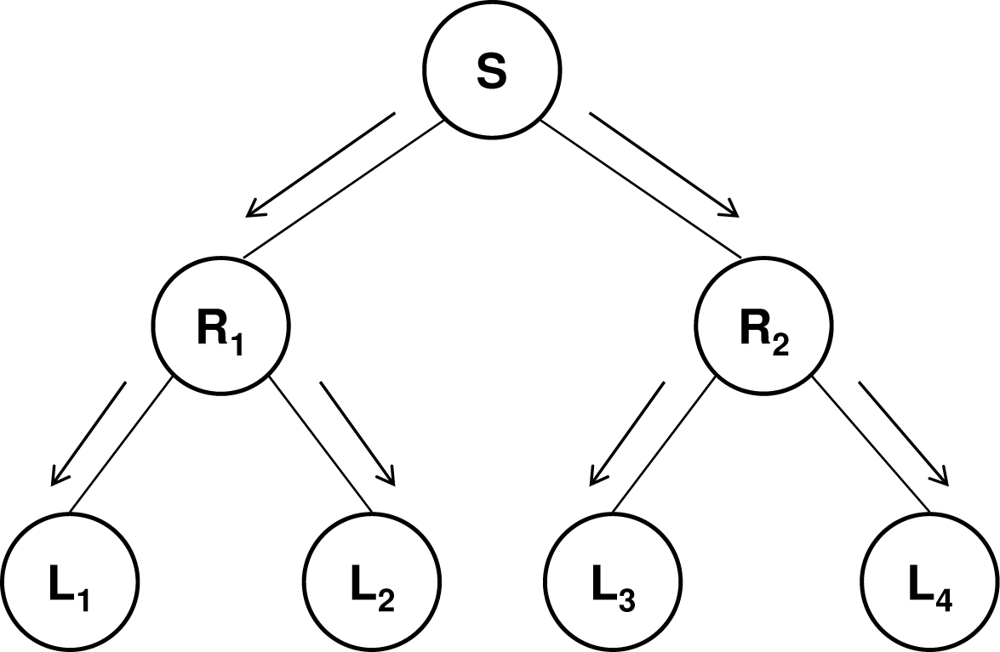 R2) that receive the content from their parent node and retransmit it to their child nodes (by replicating it for each child), and the leaves (