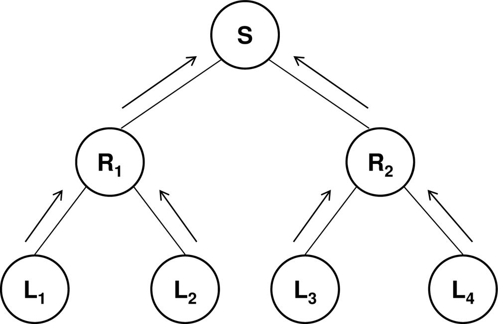 S) of the tree is the source sending the data, the intermediate nodes are the routers (
