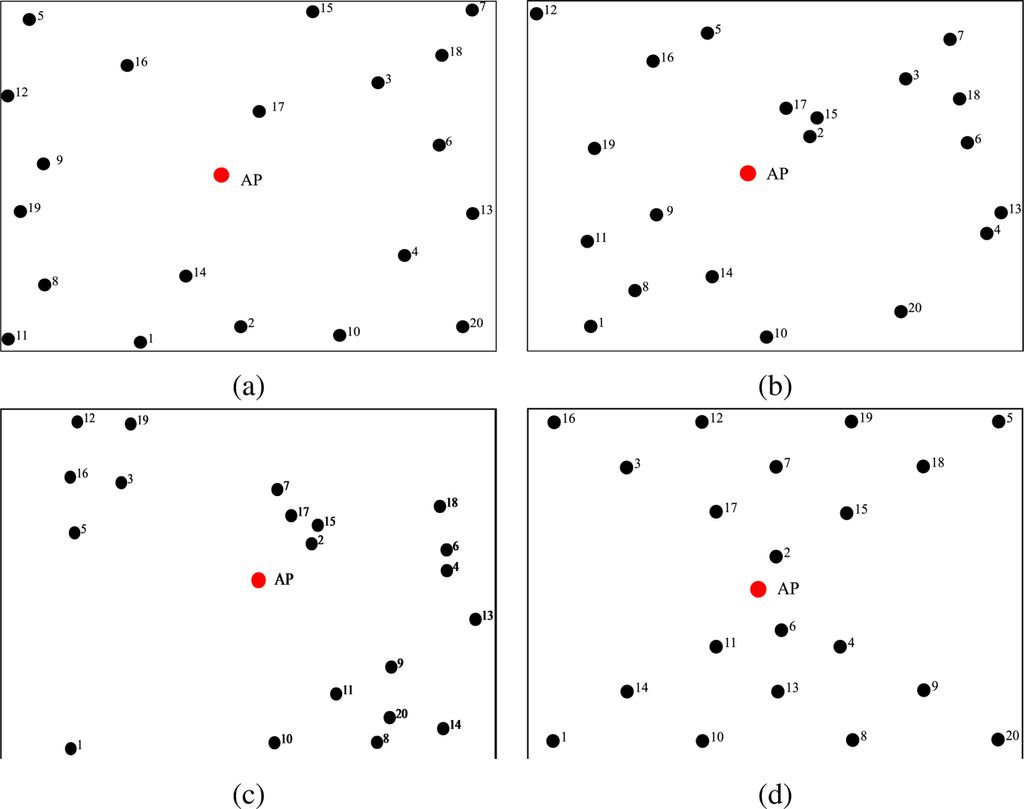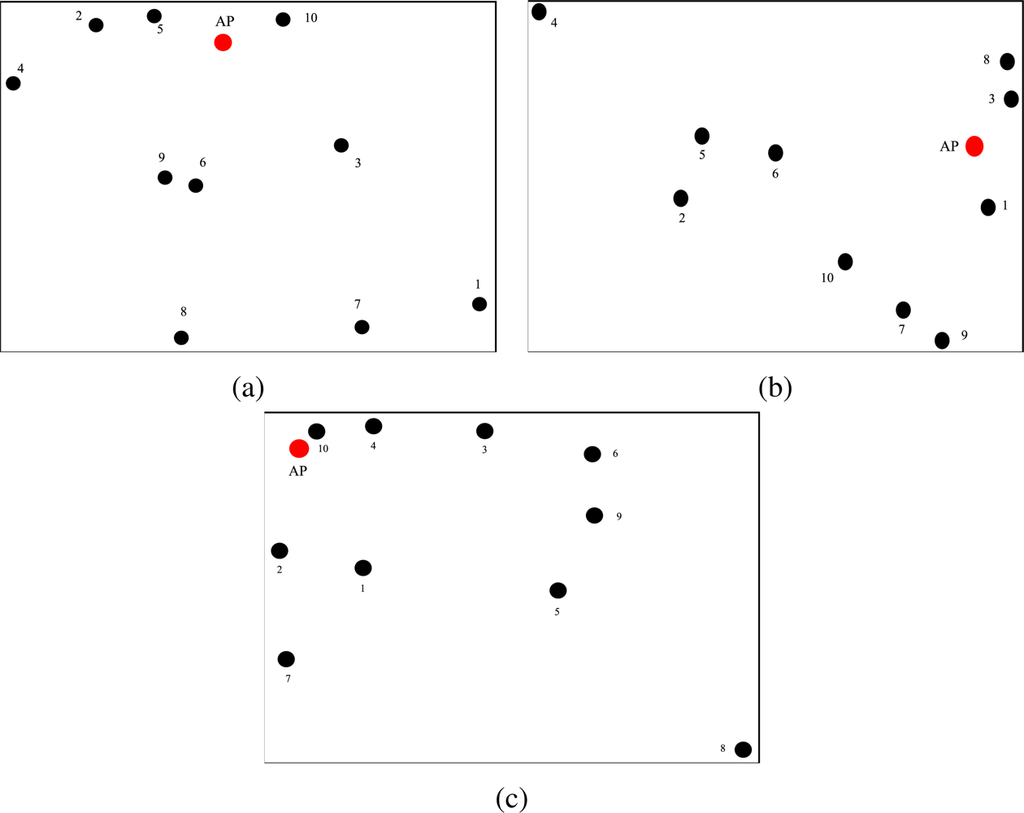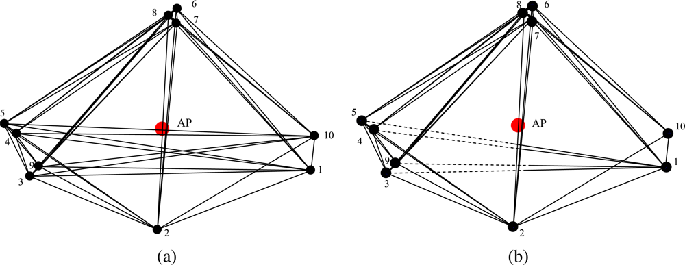 ) and (b) each node to reach at most the AP (the per-node transmit power is denoted as