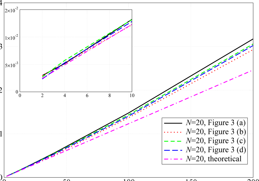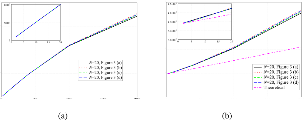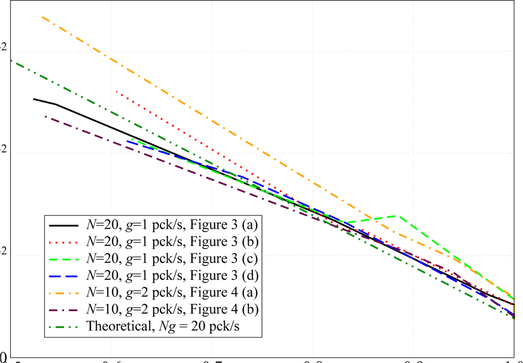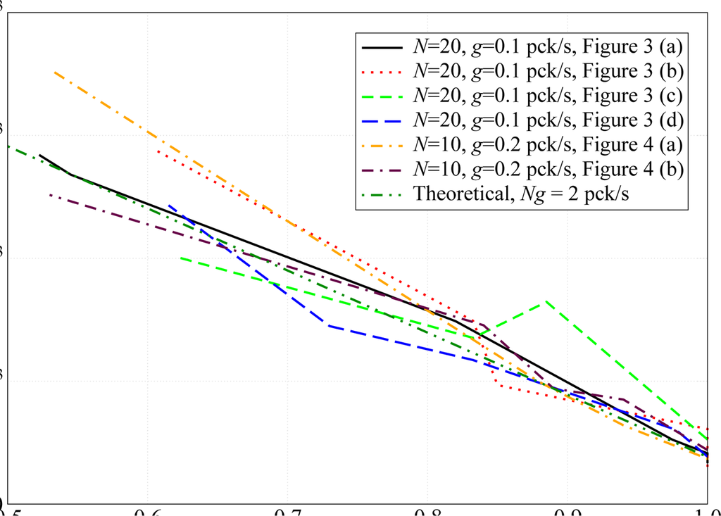 Similar considerations can be carried out for the delay performance, analyzed in Figure 11b. In this case, there is also a good overlap between the simulation curves relative to different topologies and scenarios with different numbers of remote nodes. In particular, the number of ones in the adjacency matrix, i.e., the number of active connections, is the only characteristic that affects, for small values of the aggregated offered traffic load, the network performance. When the traffic load increases, however, the assumptions made in Section 2. do not hold anymore. In this figure, the analytical curve given by the expression in Equation 10 is also shown. In this case as well, the delay predicted by the analytical model is lower than that obtained with simulations. As in the previous case, the impact of the backoff procedure, due to the packet retransmission, has not been taken into account, thus the average delay predicted by our analytical model is lower.