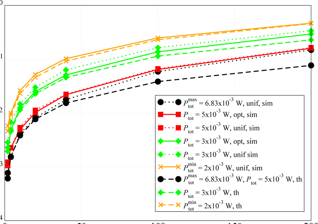 Wireless sensor networks (WSNs) are an interesting research topic, both in military [–] and civilian scenarios []. In particular, remote/environmental monitoring, surveillance of reserved areas, etc., are important fields of application of WSNs. These applications often require very low power consumption and low-cost hardware []. One of the most common standards for wireless networking with low transmission rate and high energy efficiency has been proposed by the Zigbee Alliance []. In this context, an interesting research direction for WSNs is the design of network architectures that can guarantee high energy efficiency. In particular, since the overall energy available in a WSN is typically limited (all nodes are battery-equipped), the research community has focused on the derivation of transmit power allocation strategies that maximize a specific performance indicator yet still guarantee high energy savings.