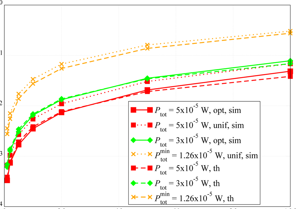 The simulations have been carried out using different values of the overall network transmit power and, consequently, different values of the transmit powers allocated to the sensors. In particular, we have considered two possible transmit power allocation strategies: (i) each node has the same transmit power (uniform power allocation); (ii) the transmit power varies from node to node and is allocated using the strategy presented in Subsection 2.3.; (iii) the transmit powers are allocated according to the strategy proposed in []. In all cases, the obtained simulation results are directly compared with the results predicted by the theoretical model. In fact, referring to the scenarios shown in Figure 3 and Figure 4, we have first set the same transmission power at each node in order to allow (a) each couple of nodes to communicate with each other (the used transmit power is denoted as