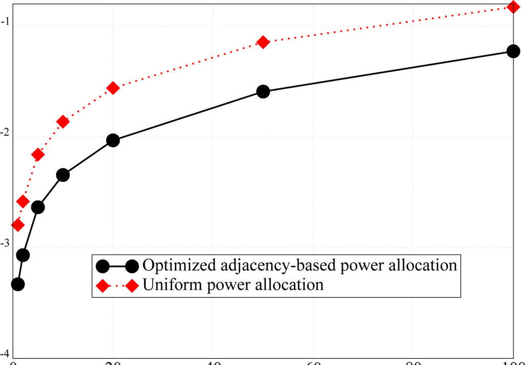 - In the proposed adjacency matrix-based power allocation strategy, the power is different at each sensor and is set according to optimization strategy presented in Section 2., where the total amount of available transmit power is assigned to each sensor in order to minimize the PER at the AP. This rule leads to allocate small transmit powers to nodes which are isolated and large transmit powers to nodes which can be connected with a large number of remote nodes. In this way, it is possible to minimize the collisions at the AP. Of course, there will still be nodes which cannot sense each other (leading to possible collisions), but this is due to the limited amount of overall network transmit power.