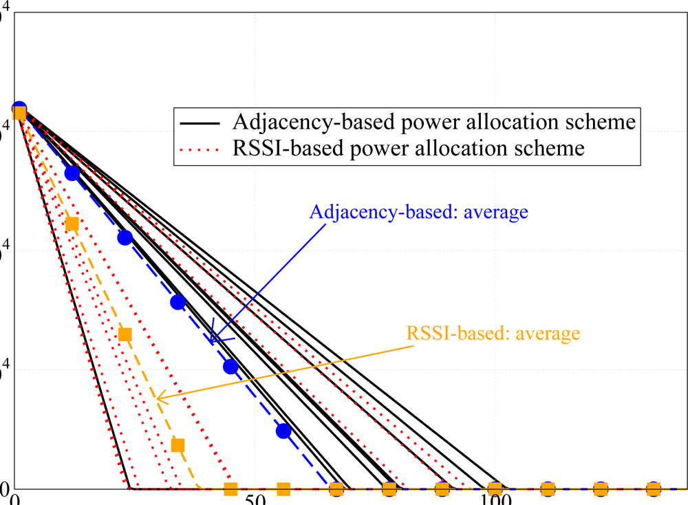 In order to highlight the energy saving improvement introduced by our power allocation technique, we have considered the network, shown in Figure 5c, with N = 10 nodes randomly deployed over a 50 m2 square surface, where, unlike all previous scenarios, the path loss exponent α is 3 — recall that all previous results refer to scenarios with α = 2.1. In this case, the transmit power at each node is larger, so that the impact of the transmit power on the energy consumed in the tx state is more evident. In Figure 17, the residual energy in each node is shown, considering both the adjacency matrix-based transmit power allocation strategy proposed here and the RSSI-based power allocation scheme presented in []. Considering the proposed power allocation strategy (solid lines), the use of lower transmit powers allows to drastically reduce the nodes’ deaths. In particular, excluding the case of a specific node which is far from the AP and uses a high transmit power, the other nodes die later than in the case with RSSI-based power allocation scheme (dotted lines). In fact, according to the proposed model, a node delays its packet transmission if it senses that other neighboring nodes are transmitting. In this way, since a larger number of nodes can sense each other, the number of transmissions (successful or not) reduce and the nodes waste less power to process incoming packets. In the same figure, the average residual energy for both proposed power allocation schemes is also shown. These curves confirm that the adjacency-based power allocation scheme allows to extend the network lifetime because it increases the network residual energy.