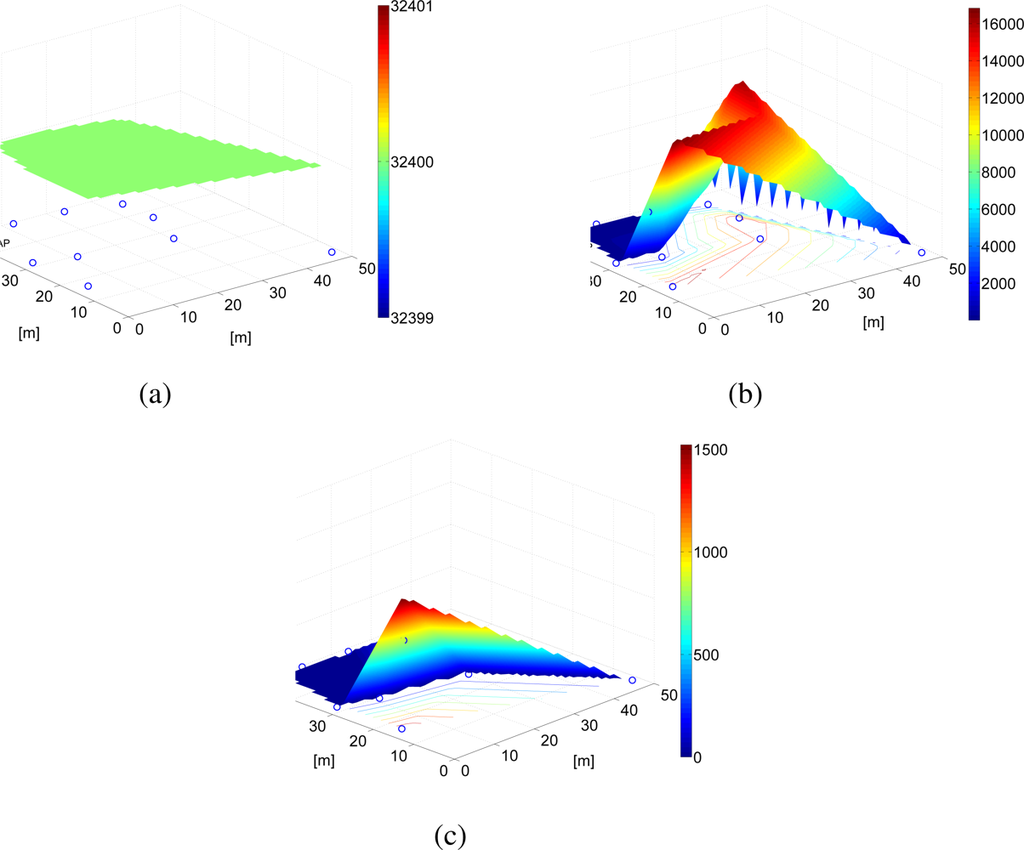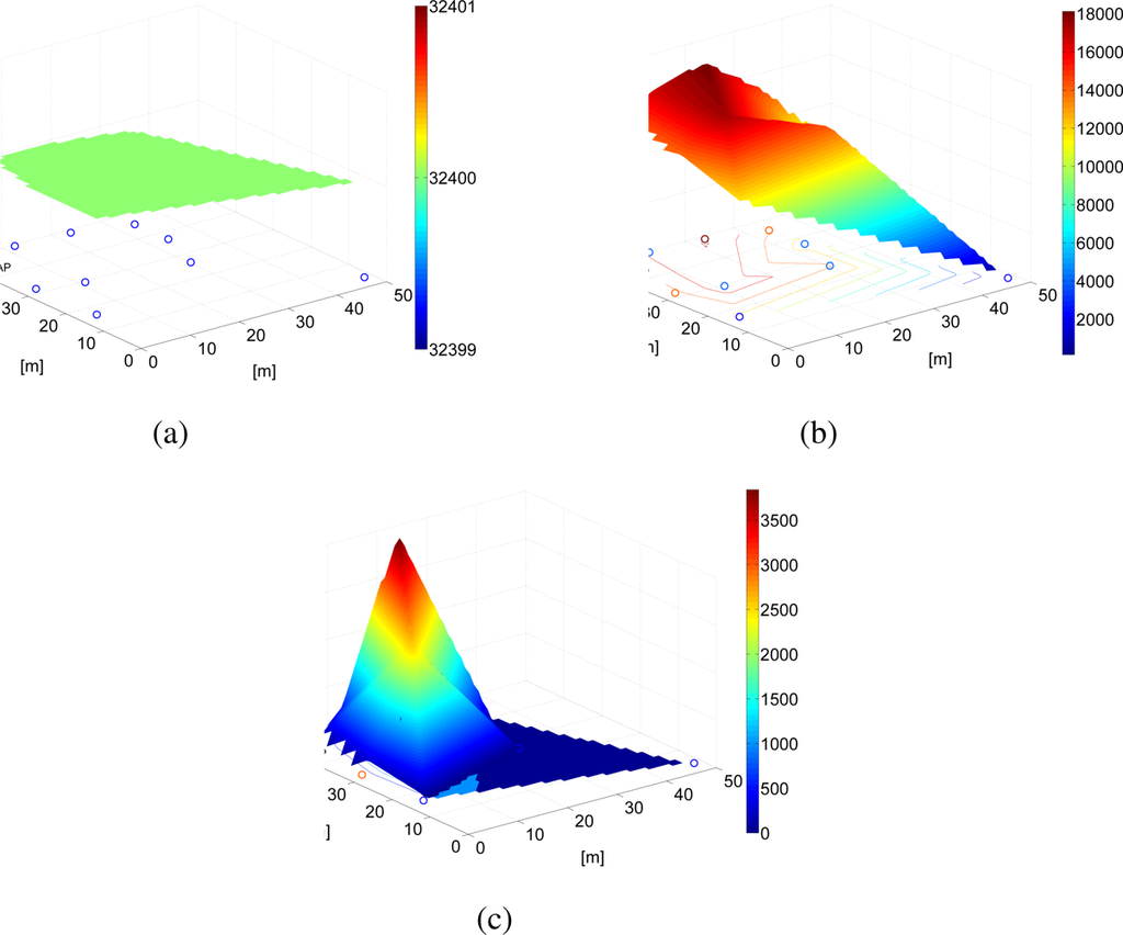 Since each node transmits with a different power and receives a different number of packets from neighboring nodes, it will experience different power consumptions according to its spatial position and the number of surrounding nodes. In Figure 18, the energy distribution in the network considering the use of the proposed power allocation strategy is shown. The reference topology is the same as that considered in Figure 17 (i.e., the network topology of Figure 5c). In Figure 18a, the initial energy in the network, i.e., at all nodes, is shown. As one can see, since all nodes have the same battery energy (3.24 kJ), the initial “surface” lies on a plane. In Figure 18b, a snapshot of the residual energy in the network after 45 days is presented. The residual energy in the node far from the AP is lower than that in the other nodes, because this node transmits with much higher power. Finally, in Figure 18c, the residual energy in the network is presented after 100 days. The farthest node from the AP has run out of battery, but the other nodes are still able to communicate, since the use of low (on average) transmission powers prevents rapid battery depletion.