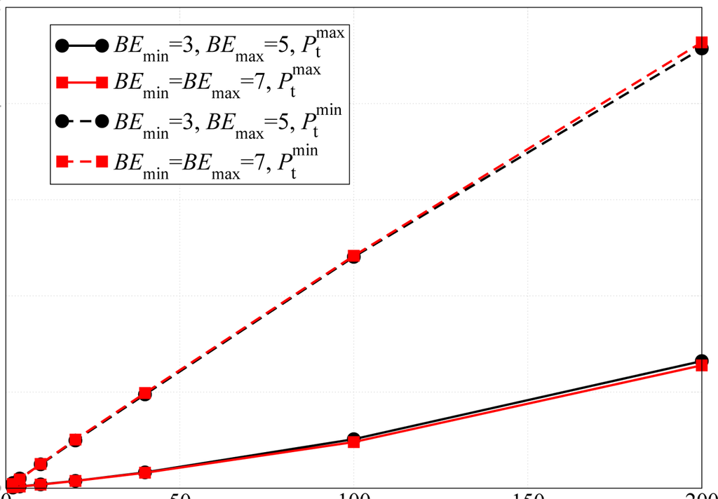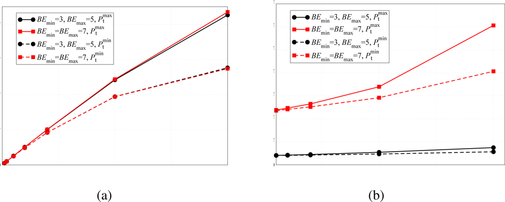 The validity of the analytical model has also been verified in terms of delay and network transmission rate. The corresponding results are shown in Figure 7. As for the PER results in Figure 6, the network transmission rate is not affected by the use of different backoff exponent values. In fact, this performance indicator is strictly related to the PER, therefore, recalling the results shown in Figure 6, the network transmission rate remains basically the same for different values of BEmax. Considering Figure 7a, the solid lines, which refer to the case with default backoff exponent, and the dashed lines, which refer to the case with modified backoff exponent, basically overlap. On the other hand, the use of different backoff exponents affects the delay performance. Since the backoff window is larger in the case with BEmin = BEmax = 7, a node may wait for a longer period before sending the packet on the channel. Considering Figure 7b, it can be observed that the delay is longer in the case with the modified backoff exponent. In fact, in this case a node has to wait, on average, for a longer period before transmitting a packet. In addition, using the transmit power