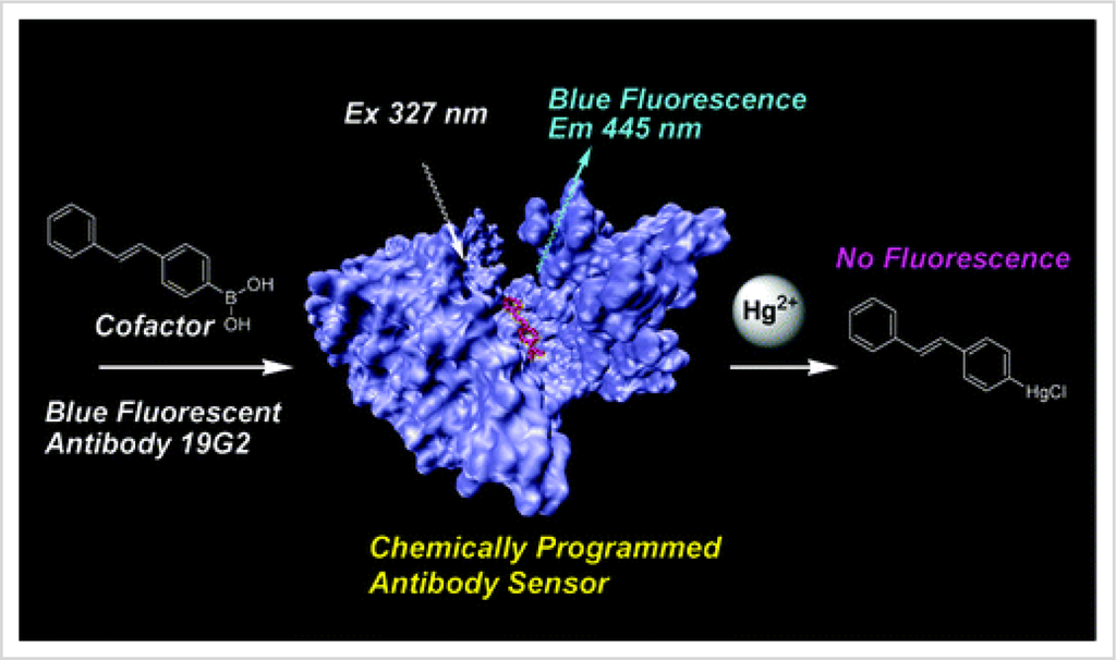 - Matsushita, M.; Meijler, M.M.; Wirsching, P.; Lerner, R.A.; Janda, K.D. A Blue Fluorescent Antibody-cofactor Sensor for Mercury. Org. Lett 2005, 7, 4943–4946. [Google Scholar]