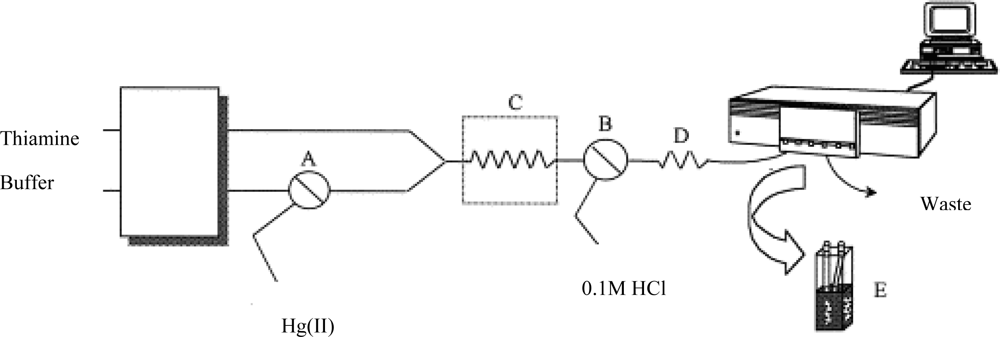 A chemical sensor combined with a flow injection system can continually measure mercury in the environment. For example, a sensor based on a non-ion exchanging solid support with thiamine was developed to selectively and sensitively determine ionic mercury (Figure 2) [32]. The principle of the method was the oxidation of thiamine to fluorescent thiochrome. The mercury induced fluorescence signal was proportional to the mercury concentration.