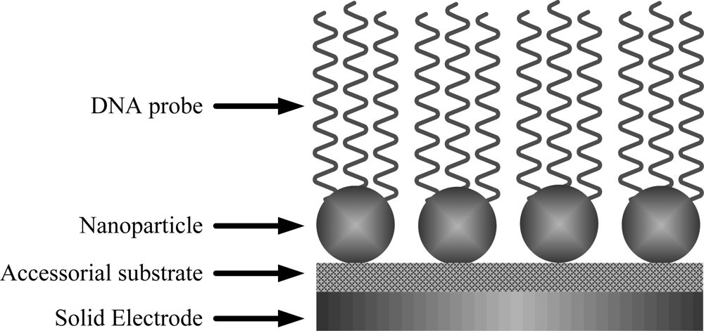 As we know, the most critical step while preparing a DNA biosensor is the immobilization of DNA probe on the surface of a sensing device such as an electrode. The amount of immobilized DNA probe will influence the accuracy, sensitivity, selectivity, and life of a DNA biosensor directly. Because of the high surface-to-volume ratio and excellent biological compatibility, nano-materials can enlarge the sensing surface area to increase the amount of immobilized DNA greatly, and the DNA mixed with nano-materials can keep its biological activity well.