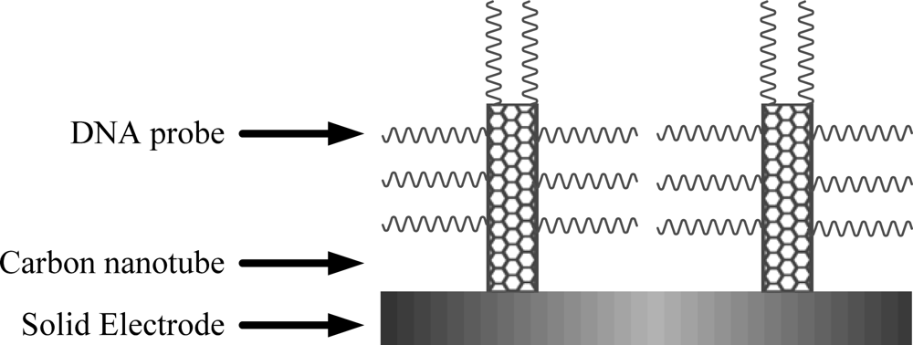Other materials used for DNA attachment to CNTs were also reported. Guo et al. [] described a method of DNA immobilization on CNTs through amidation. DNAs were covalently immobilized on MWCNTs via diimide-activated amidation between the carboxylic acid groups on the carbon nanotubes and the amino groups on DNA bases. Similarly, Jung et al. [] covalently immobilized DNA oligonucleotides to prepatterned SWCNT multilayer films by amidation. Guo et al. [] studied the electrostatic assembly of calf thymus DNA on MWCNTs modified gold electrode via poly (diallyldimethylammonium chloride) (PDDA), a cationic polyelectrolyte. They found that the electrode modified with MWCNTs had significantly enhanced the effective electrode surface area in addition to providing negatively charged groups for the electrostatic assembly of cationic polyelectrolyte.