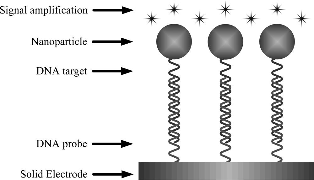 In recent years, DNA biosensors based on nucleic acid hybridization have been vigorously pursued. DNA biosensors are defined as analytical devices incorporating a single-stranded oligonucleotide (probe) intimately associated with or integrated within a physicochemical transducer or transducing microsystem, which may be optical, electrochemical, thermometric, piezoelectric, magnetic or micromechanical. The aim of a DNA biosensor usually is to produce either discrete or continuous measurable signals, which are proportional to the concentration of complementary (target) DNA sequence. Because of their specificity, speed, portability, and low cost, DNA biosensors offer exciting opportunities for sequence-specific DNA detection. However, the concentration of genetic targets is very low in biological samples, making it unsuitable for detection by a DNA biosensor. Therefore, an ultrasensitive method of detecting nucleic acids is clearly essential.