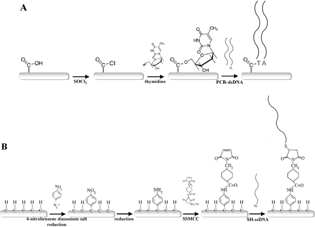 - Kremsky, J.N.; Wooters, J.L.; Dougherty, J.P.; Meyers, R.E.; Collins, M.; Brown, E.L. Immobilization of DNA via oligonucleotides containing an aldehyde or carboxylic acid group at the 5′ terminus. Nucleic Acids Res 1987, 15, 2891–2909. [Google Scholar]