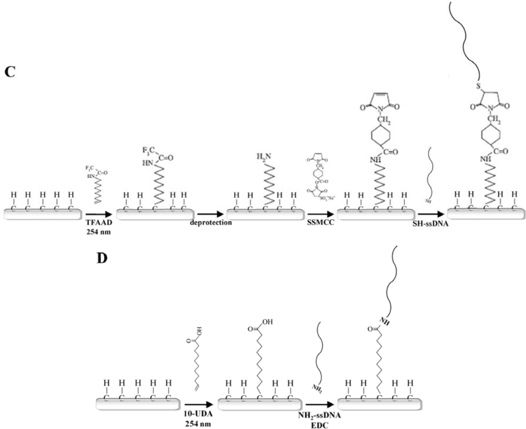 - Strother, T.; Cai, W.; Zhao, X.S.; Hamers, R.J.; Smith, L.M. Synthesis and characterization of DNA modified silicon (111) surfaces. J. Am. Chem. Soc 2000, 122, 1205–1209. [Google Scholar]