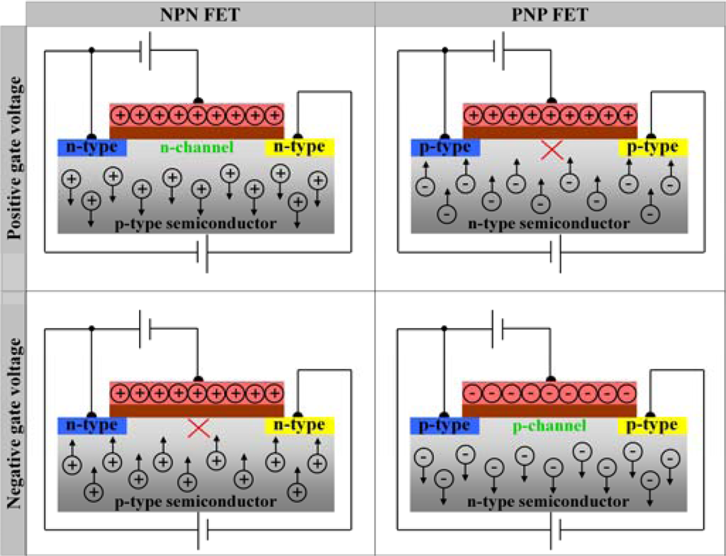 - Applying a positive gate voltage to a p-channel FET (PNP FET) causes the electrons in the n-type semiconducting body electrode to become attracted to the gate electrode. This negatively charged channel blocks current flow between source and drain.
