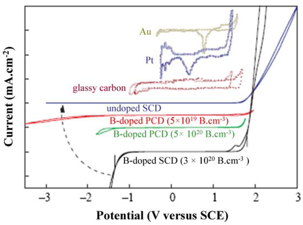- Chakrapani, V.; Angus, J.C.; Anderson, A.B.; Wolter, S.D.; Stoner, B.R.; Sumanasekera, G.U. Charge transfer equilibria between diamond and an aqueous oxygen electrochemical redox couple. Science 2007, 318, 1424–1430. [Google Scholar]