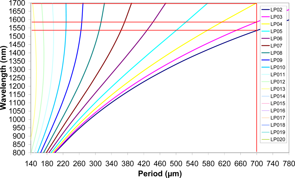 Due to the dependence of the effective index on the wavelength, the interrelation between coupled wavelength and period is not linear, as can be observed in Figure 1. For a given LPG period, Λ, the resonant wavelengths of each mode,