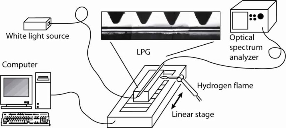A periodically grooved plate is located and pushed with a fixed force over a region of the standard fiber. Next, it is heated with a very localized hydrogen flame and, hence, the groove shapes are permanently written on the fiber. As it can be observed in Figure 2, the hydrogen flame (∼2,000 °C) sweeps the fiber-grooves region using a linear stage controlled by a computer. In this way, the LPG profile can be even apodized. In order to follow the writing process in real-time, the LPG optical behaviours are monitorized using a broadband light source (Agilent 83437A) and an optical spectrum analyzer (HP86142A). The source consists of 4 appropriate LEDs covering the spectral range from 1,200 to 1,700 nm.