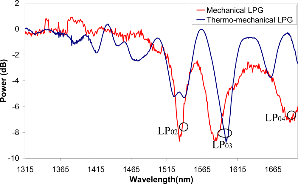 As shown in Figure 3 (in red) the transmission spectrum response of a mechanically induced LPG (pushing a grooved plate of 700 μm period and 5 cm length over the fiber) is in agreement with the simulations.