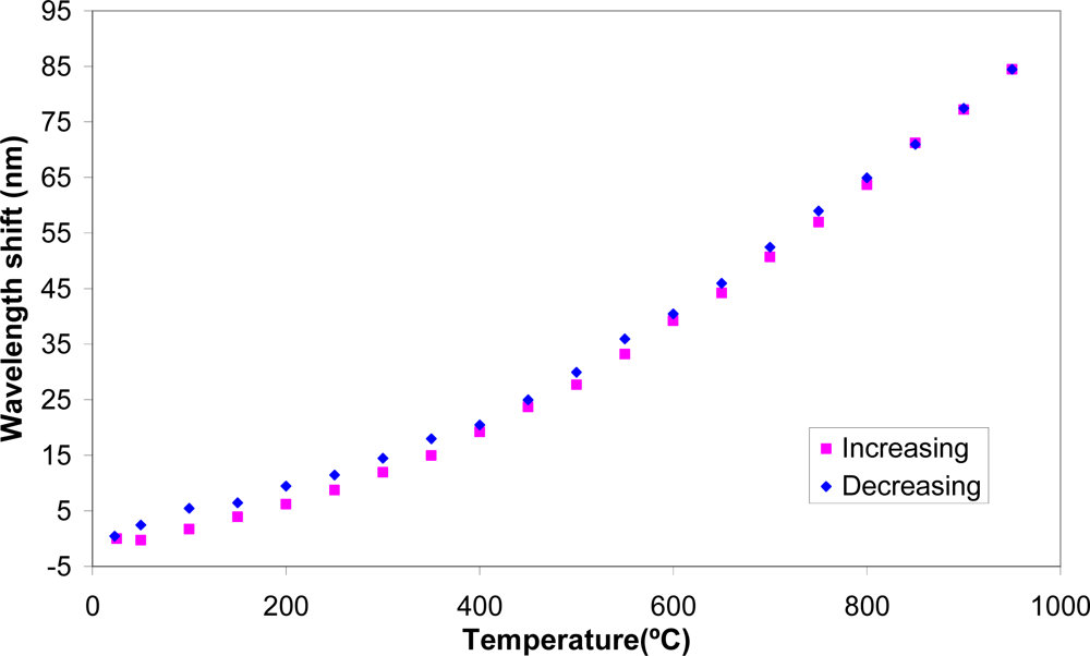 Temperature sweeps between 25 to 950 °C and vice versa were carried out and results are summarized on Figure 4. An attenuation peak shift of ∼85 nm in the mentioned temperature range was encountered. The peak returns to the original position what means that no appreciable hysteresis effect (with the temperature) is observed in this LPG device.