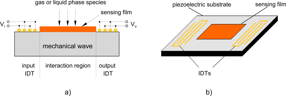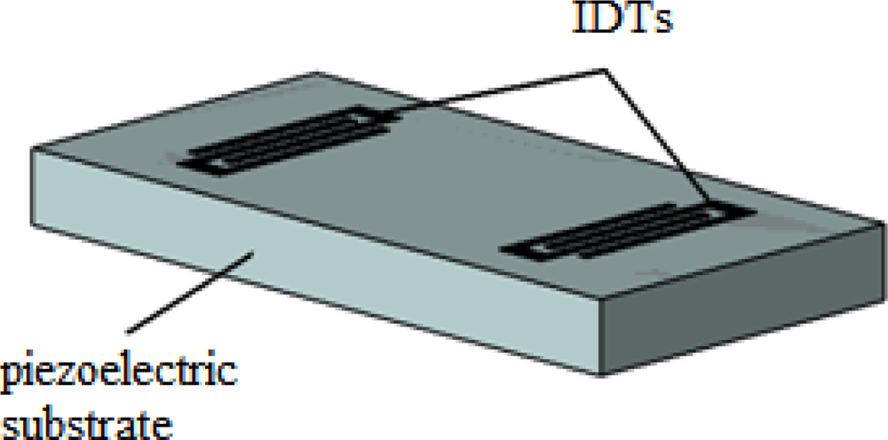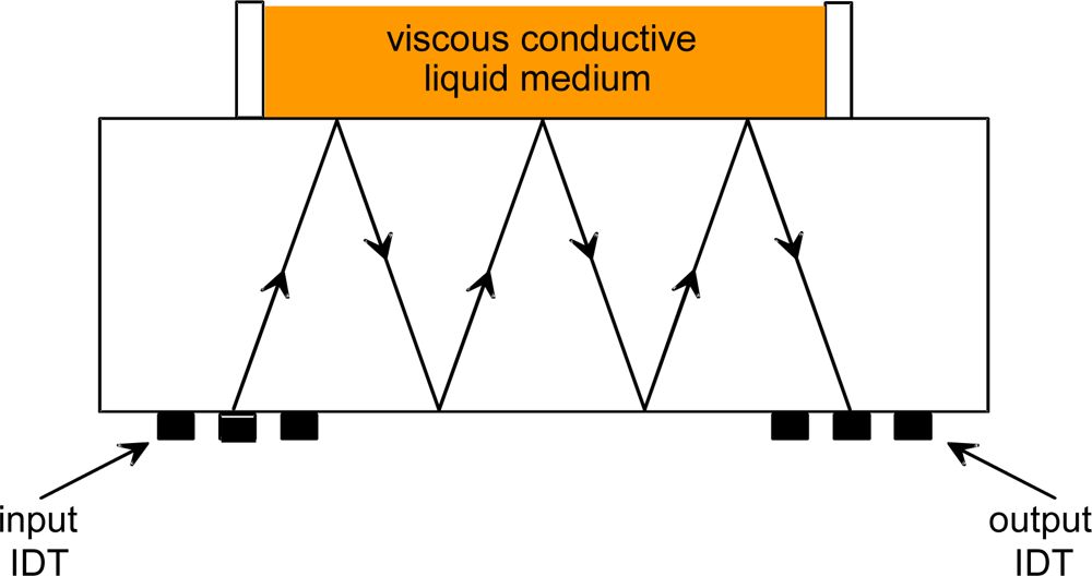SGAW devices have been utilized as chemical sensors in both gaseous and liquid media. The input port of a SGAW sensor, comprised of metal electrodes (IDTs) deposited or photodesigned on an optically polished surface of a piezoelectric crystal, launches a mechanical acoustic wave into the piezoelectric material due to the inverse piezoelectric phenomenon and the acoustic wave propagates through the substrate (Figure 1). Biochemical interactions at the sensor surface cause changes in the properties of the acoustic wave (wave propagation velocity, amplitude or resonant frequency). These changes can be detected with network analyzers, vector voltmeters or more simple electronics, such as oscillators. The dimensions and physical properties of the piezoelectric substrate determine the optimal resonant frequency for the transmission of the acoustic wave [].