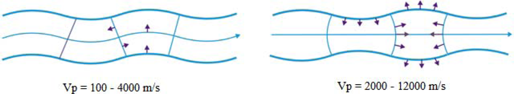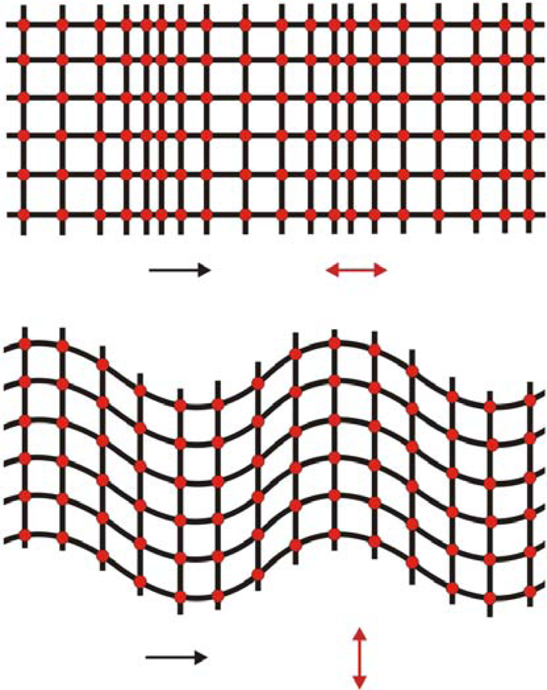 Top view of particle displacements of plane acoustic waves propagating in a solid. (Top) longitudinal or compressional wave. (Bottom) shear or transverse wave. Black arrows indicate the wave propagation direction and red arrows indicate the particle displacement directions.