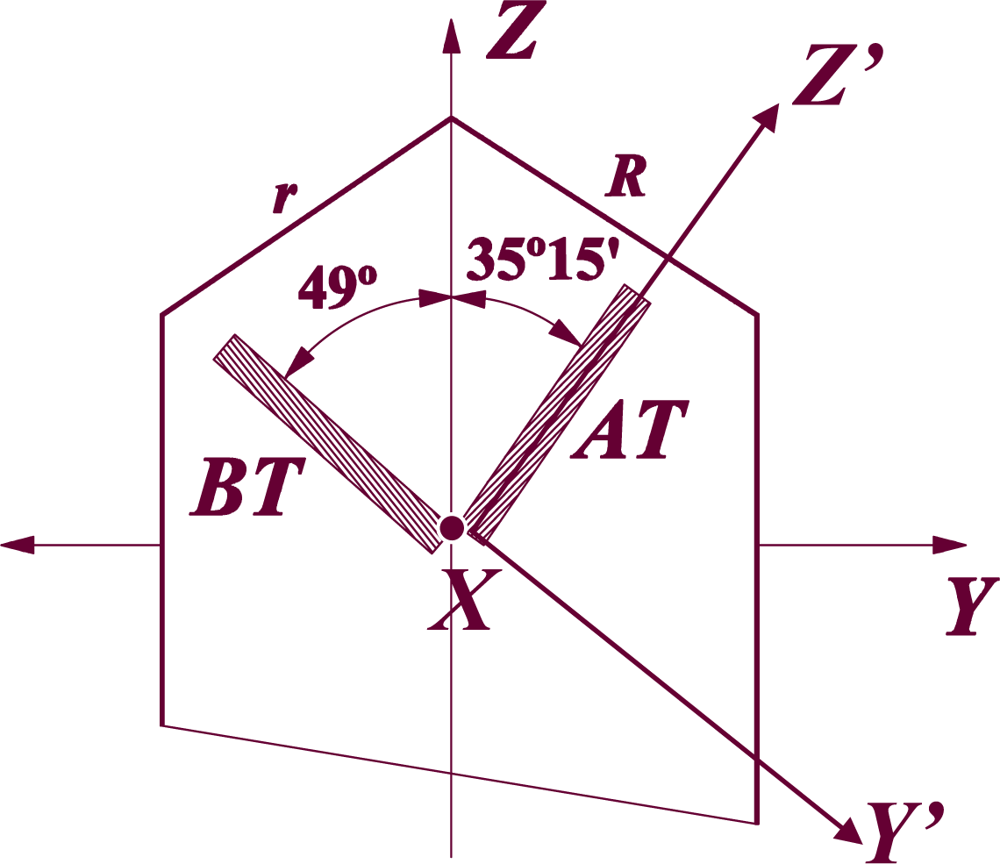 Y’-cuts of a quartz crystal (AT cut is 35°15′ rotated about the X- axis and BT cut is 49° rotated about the X- axis).