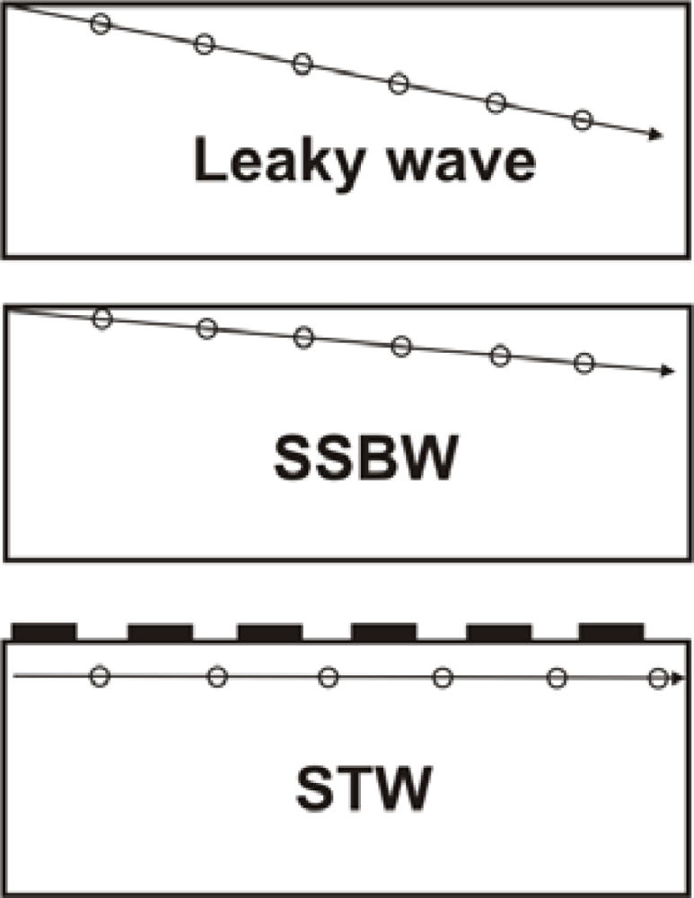 The difference between leaky waves and SSBW waves is the wave propagation angle. Leaky waves have a larger propagation angle than SSBW waves. Figure 14 shows a scheme exemplifying the propagation angles of Leaky, SSBW and STW. As can be seen, Leaky waves have a higher propagation angle than SSBW and STW waves.