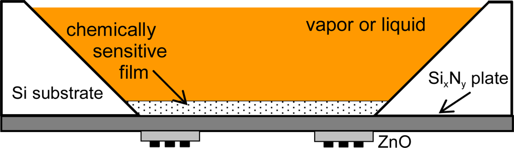The advantage of this device is that the IDTs can be located on the back side of the device and are thus away from the sensing side, what insolates the IDTs from the liquid (Figure 16). Thus, corrosion problems on electrodes resulting in deterioration of the sensor response are avoided. However, the main drawback of using SH-APMs is the fact that they are difficult to operate in a standard oscillator circuit. The reason for this is that several acoustic plate modes are usually excited simultaneously, but the frequency separation between these modes is often limited; which can produce a hopping mode in an oscillator circuit []. Additionally, mechanical and electrical loading of the surface can affect the APM sensor response; especially if a high-coupling piezoelectric material like LiNbO3 is used, the acoustoelectric interaction becomes important [].