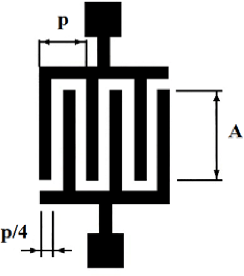 Interdigital Transducer (IDT) with period p, electrode width equal to space between electrodes and aperture A.