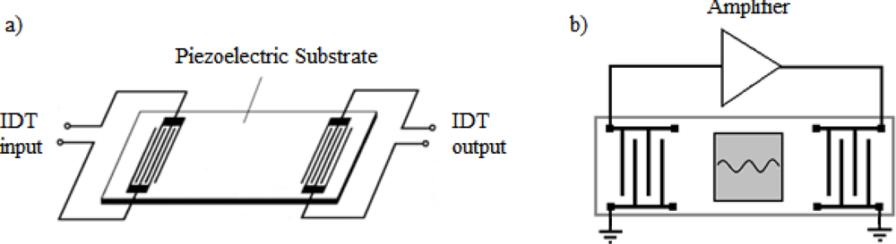 a) Two IDTs SGAW configuration. b) Two-port SGAW delay line oscillator. The SGAW device provides a feedback path for the amplifier. For a stable oscillation the signal must return to its starting point having equal amplitude and being shifted in phase by an integral multiple of 2π radians [].