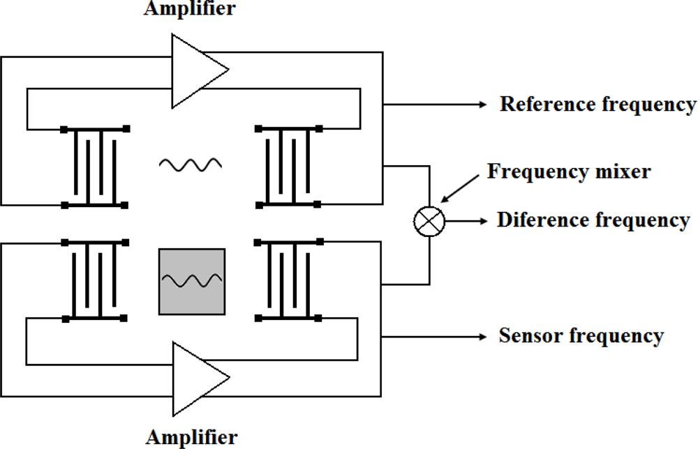 This configuration consists on having two identical delay line oscillators (that can be fabricated on the same substrate), one for sensing, in which the recognition agent is placed, and the other one as reference, where there is not such recognition agent. Common environmental interactions responses from both delay lines are removed by subtraction [] (Figure 7). This setup is used to give a comparison of specific and non-specific responses as well as to eliminate the effects of viscosity and other disturbing influences such as temperature variations []. It also provides a signal whose frequency is easier to measure to high resolution, with simple frequency counters, than the frequency of the oscillation signal []; this reduces the complexity of the measuring electronic system. However, some authors state that a differential measurement technique cannot completely eliminate the temperature interference and the signals of the dual channel are also easily cross-talking to make the primary noise []. For dual-channel delay line oscillators where both delay lines reside on the same substrate, elastic waves can induce cross coupling and synchronization can occur []. Other researches stated that this setup does not significantly improve the measurement, at least not for the few minutes the sensor takes to respond [], though they do not explain the reason.