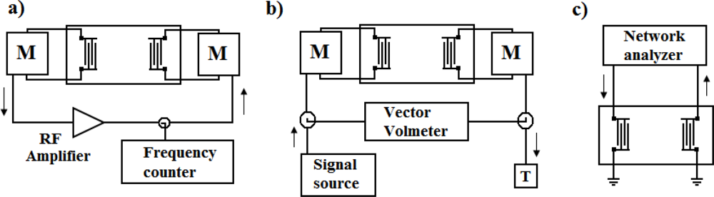 Network analyzer is the instrument of choice to measure frequency responses of either one- or two-port devices, due to the fact that this setup allows a complete characterization of the devices under all conditions, including those for which the oscillator method fails. For two-port devices (see Figure 8c) the network analyzer records the transmitted signal to obtain the impedance characteristics of the device. Therefore, it works in the same way that a signal generator/vector voltmeter configuration being possible to measure amplitude and phase information of the signal as a function of the input frequency. Frequency scans can also be made during experiments to determine the device response as a function of time [].
