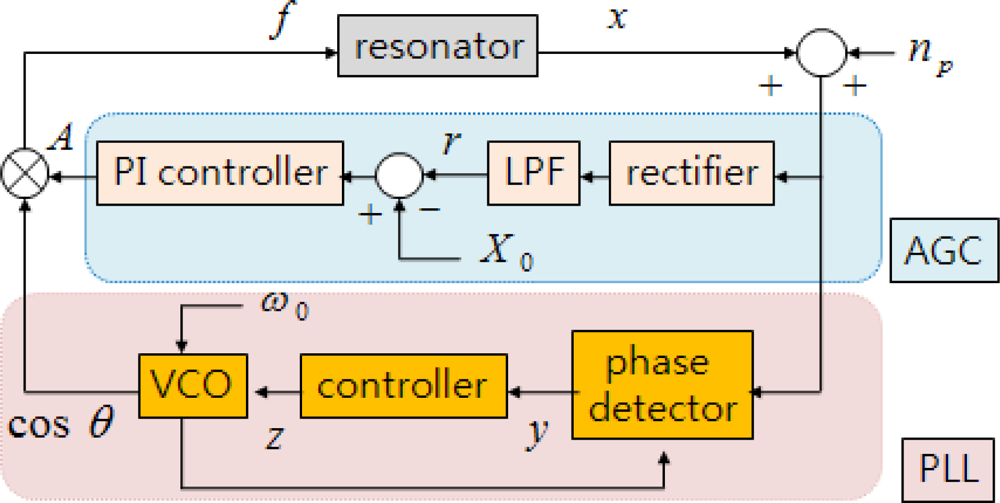 where A is the magnitude of the input and θ is the instantaneous phase of the input. The magnitude should be chosen to make the difference between the measured and the specified amplitude, X0, equal to zero. Therefore, A should have an AGC form. On the other hand, cosθ should have a PLL form because it should recognize the resonance when the difference in phase angle between a control input and a displacement is 90°.