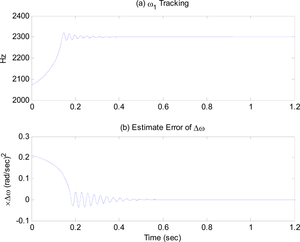 Figure 3(a) shows that the frequency tracking control on the first proof-mass tracks the resonant frequency. The excitation frequency starting from free oscillation frequency of PLL, ω0 = 0.9ω1, reaches the resonant frequency of the proof-mass in 0.4 second and then maintain its value. The averaged resolution of the excitation frequency from (23) is σ1 ≈ 0.004 Hz. Figure 3(b) shows the response of the estimation error, Δω̃, showing that it converges to zero around 0.6 second.