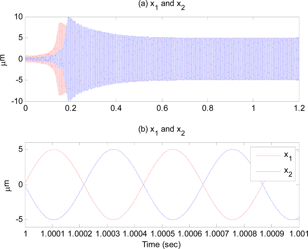 As soon as the estimation error becomes zero, the dynamic characteristic of the second proof-mass begins to have the same resonant frequency as the first proof-mass, as observed in Figures 4. The estimation error of Δω calculated from (38), is less than σ2 ≈ 0.01% ×Δω̃. Figure 4(a) is the displacement response of the proof-mass. Its amplitude is maintained at the specified value, X0 = 5 μm, after some time. Figure 4(b) zooms in the response plotted in Figure 4(a) for 1 msec, showing that the two proof-masses oscillate in anti-phase with same resonant frequency and amplitude.