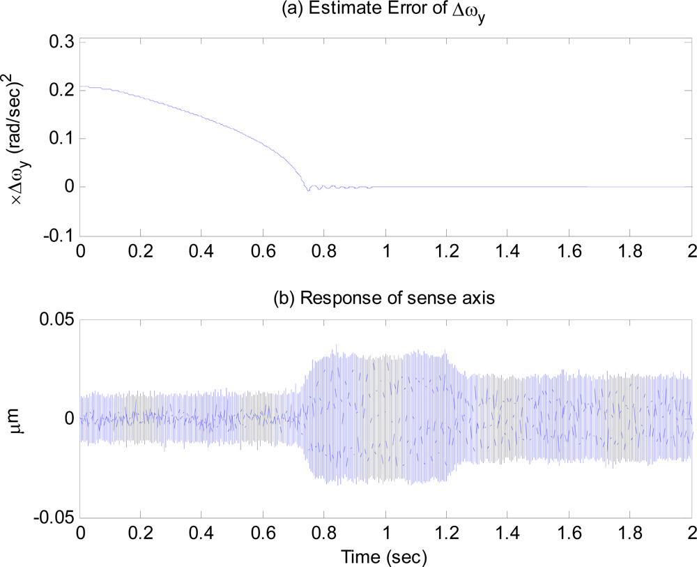 (a) Frequency tuning estimation error, (b) Time response of sense axis.