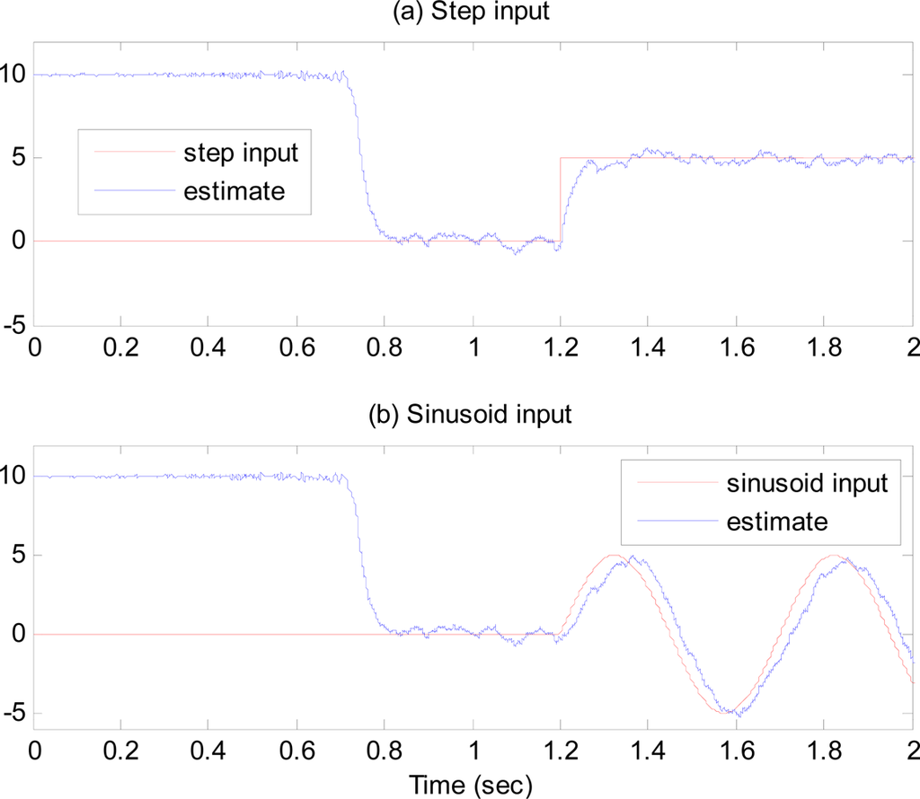 Time response of angular rate estimates to (a) step input, (b) sinusoid input.