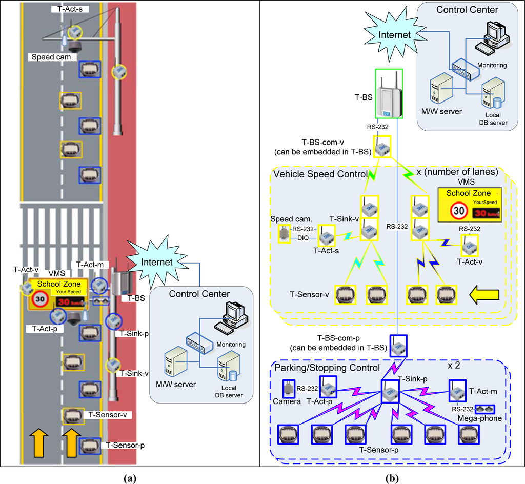 S3 consists of a Telematics Sensor Network (TSN) at the bottom and a management system at the top (Figure 1). TSN is divided into two different sub-networks. The first sub-network is to detect vehicles parking or stopping close to a cross-walk [‘Parking/Stopping Control’ in Figure 1(b)]. This sub network controls a loudspeaker module to warn vehicle drivers and a video camera to record the violating vehicles. The other sub-network is to measure the speeds of vehicles passing through the school zone [‘Vehicle Speed Control’ in Figure 1(b)]. Assuming a vehicle is moving from the bottom to the top in Figure 1(a) and from the right to the left in Figure 1(b), the speed is measured at the first set of two T-Sensor-v nodes and displayed in the VMS (Various Messaging System) sign to warn the drivers. The second set of two T-Sensor-v nodes measures the speed again, and the speed camera is used to take photos of speeding vehicles. The management system in the control center consists of a middleware server, a local DB server, and a monitoring terminal. The detailed explanation is presented in the following sub sections.