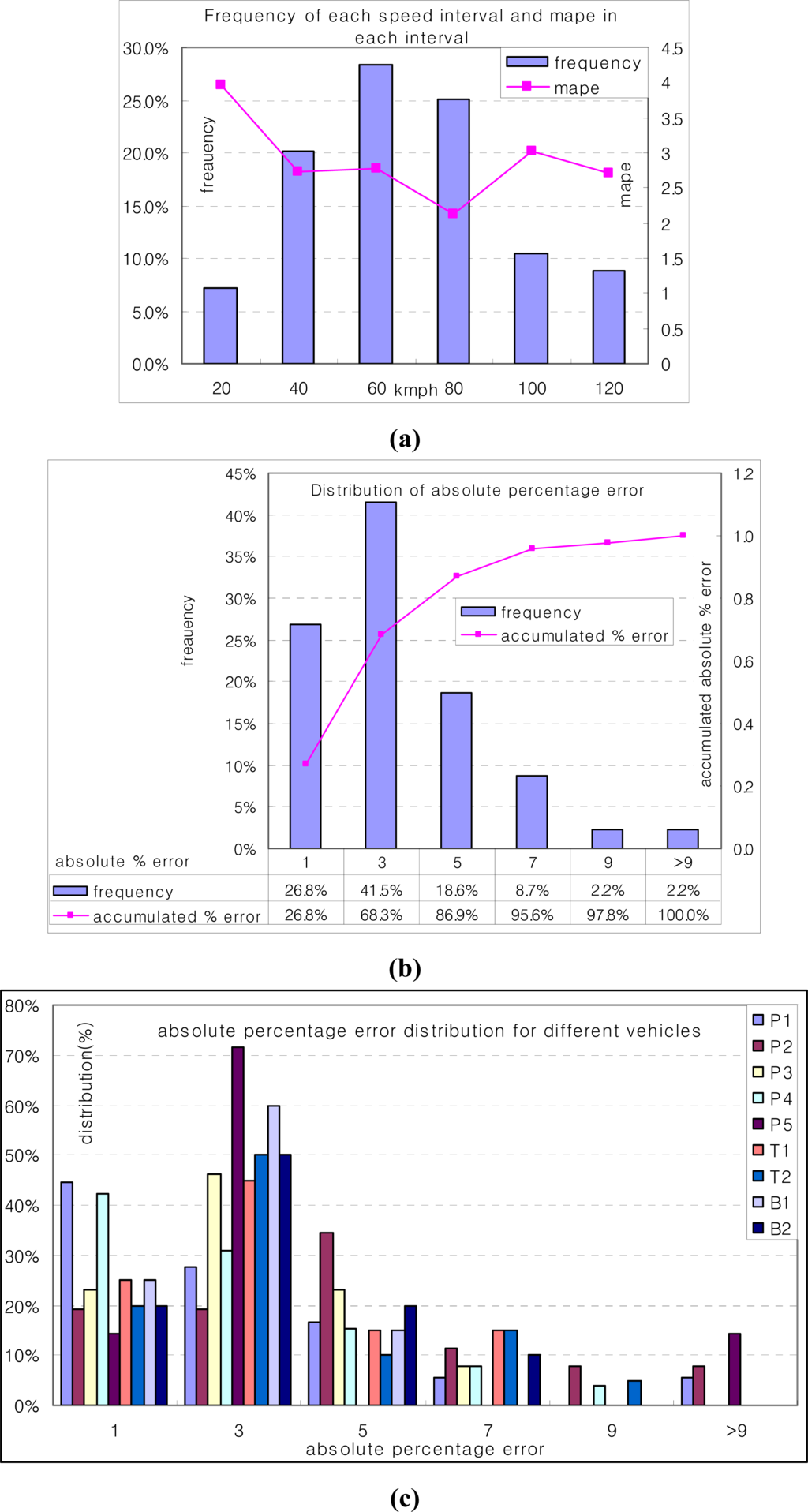 (a) Speed distribution (in the left vertical axis) and MAPE (in the right vertical axis) for each speed interval. (b) Absolute percentage error distribution in measured speed. Horizontal axis represents absolute percentage error. Left vertical axis means frequency of each absolute percentage error. Right vertical axis indicates accumulated distribution of absolute percentage error. (c) Absolute percentage error distribution for different vehicles.