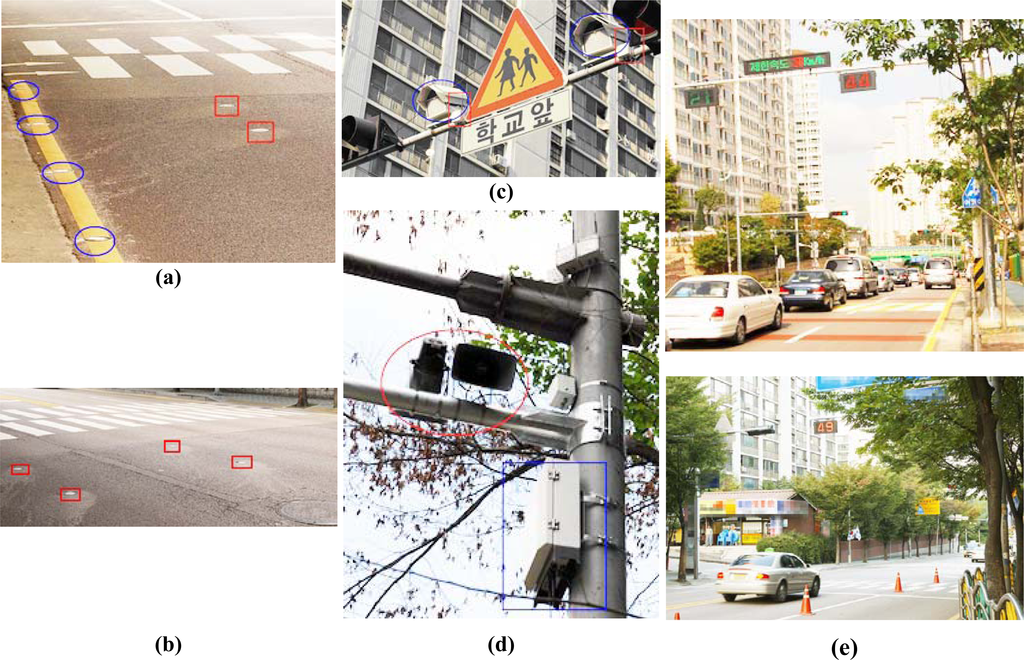 S3 in real school zones. (a) 4 T-Sensor-p nodes and 2 T-Senor-v nodes. (b) 4 T-Sensor-v nodes in two lanes. (c) Speed camera (blue circle) and T-Act-s (red rectangle). (d) T-BS (blue rectangle) and loud speakers (red circle). (e) VMS is notifying that the speed limit is 30 km/h and the current measured speed is 21 km/h (in green), 44 km/h and 49 km/h (in red).