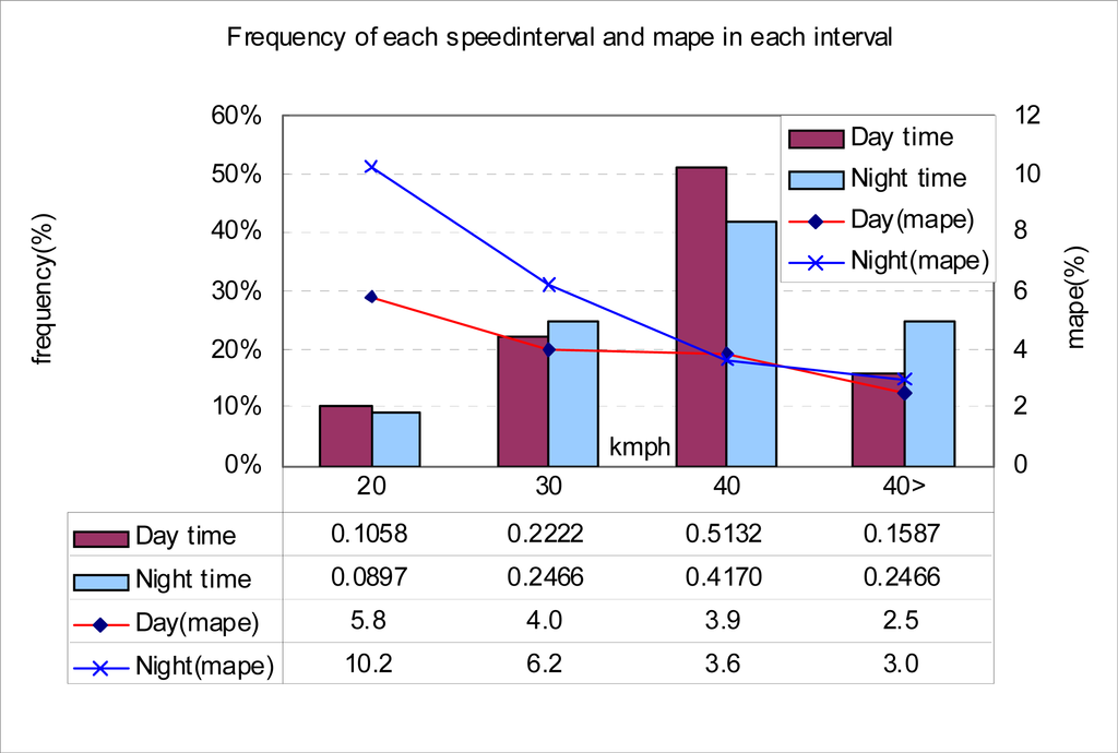 In the test site, there were two lanes [Figure 11(b)] in each direction where S3 was deployed. For comparison, the standard tape switch based speed measurement instrument was set up. The test was done on 20th Oct. in 2007. For two lanes, the measurement was performed two times, day time (before noon) and night time (from 7 pm). Radio communication of T-Sink-v node for the lane beside the walking road was severely interfered by poles of street lamps and trees by the side of the road, and we could gather only 76% and 70% of packets for day time and night time, respectively. The MAPE of detected speed by T-Sensor-v nodes was 3.7% for both day time and night time. We summarized the test result in Table 4 and Figure 12 focusing on the lane which was nearer to the center of the road.
