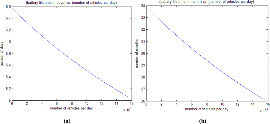 To calculate the battery lifetime, we measured the actual capacity of the downscaled battery. The actual capacity of the downscaled battery was measured with a constant current consuming load after full charging. The ratio of the measured capacity of the downscaled battery to 80% of the nominal capacity of the actual battery was 1/153. In addition, we measured the power consumption profile of a T-Sensor-v node for different operation modes such as idle, sensing, active (signal processing by MCU), and transmission (MCU + transceiver). Assuming an average traffic per day of up to 155,000 vehicles (1.8 vehicles/second, 154,570 vehicles/day is the average traffic in the busiest highway in Korea from the annual traffic census in 2006), we calculated the battery life time with the model (2) in Figure 13(a). For the maximum traffic 155,000 vehicles/day, the battery life time of T-Sensor-v node was calculated to be 5.06 days [Figure 13(a)].