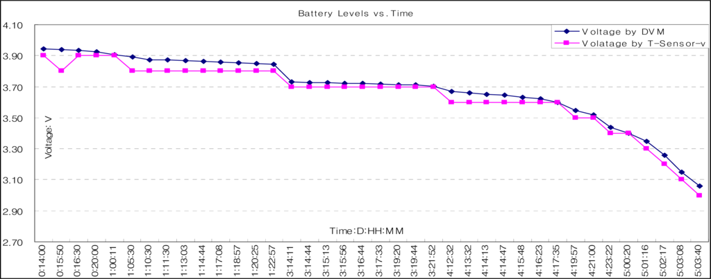 Battery-level (V) vs. time (D:HH:MM). Digital Voltage Meter (DVM) was used to measure the battery-level and T-Sensor-v node itself monitored its battery-level.