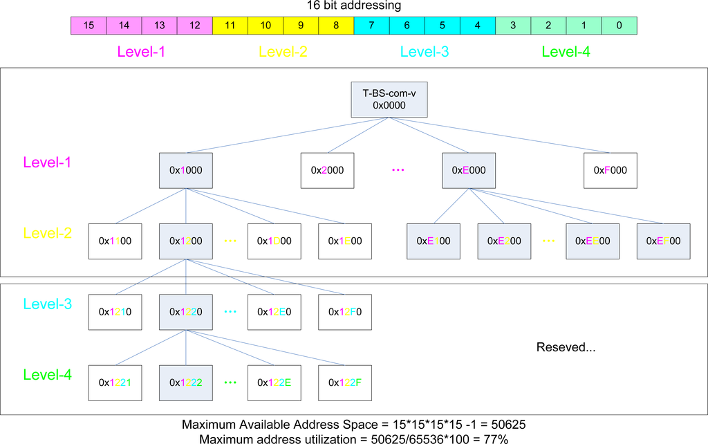 Level based Static Addressing scheme for a fast and light weight routing algorithm for SCN. Each rectagular box including a hexadecimal number represents a sensor node (e.g., T-Sink-v, T-Sensor-v, T-Act-v, etc.) in SCN, and the hexadecimal number is the assigned address for each node.
