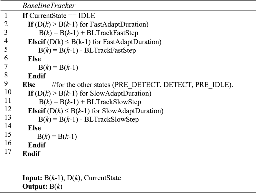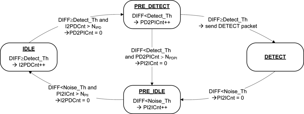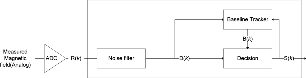 Since T-Sensor-v node is battery-operated, a low-power management system and detection algorithm is required. We determined the sampling period (Ps) after considering the maximum detectable speed and the minimum detection length of a vehicle. Most of the time, the main MCU (Microtroller Unit) is in sleep mode but it wakes up every sampling period and runs a baseline-tracking vehicle detection algorithm (BTDA, Figure 3). BTDA consists of a Noise filter block, a Baseline Tracker block, and a Decision block. Although noise is filtered by the hardware before the analog to digital converter (ADC), we adopt a moving average filter as a noise filter to filter out the remaining noise. A sample filtered signal D(k) is shown in Figure 8. Since the environmental magnetic field drifts due to environmental factors such as temperature change and sun rise or set, the baseline magnetic level when there is no vehicle over a T-Sensor-v node must be adapted to maintain sensitivity. The Baseline Tracker block performs the base line adaptation and Figure 4 shows its pseudo-code. We differentiate the adaptation rates depending on the current state so as not to adapt the baseline to the magnetic field of passing vehicles. When no vehicles are detected, the procedure quickly tracks the baseline. The Decision block takes the difference between the magnetic field and the baseline with DIFF = |D(k)-B(k)|, runs a state machine based decision algorithm (Figure 5), and decide whether or not there is a passing vehicle. There are two thresholds, Detect_Th and Noise_Th to provide hysteresis. Detect_Th is used to decide if a vehicle is detected, while Noise_Th is to release the current state to IDLE (no vehicle) state. When a vehicle is approaching and DIFF is equal to or larger than Detect_Th for the given time (time unit is in Ps) NIPD, the current state is changed from IDLE to PRE_DETECT. If DIFF is equal to or larger than Detect_Th in PRE_DETECT, DETECT packet is transmitted to T-Sink-v node and the state is changed to DETECT. When the vehicle passes through and DIFF becomes less than Noise_Th, the state is changed to PRE_IDLE state. If DIFF is less than Noise_Th for the given time NPII, the state returns to IDLE. When a vehicle is passing over a magnetic sensor, depending on the type of vehicle, there may be some points when the net magnetic field is the same as the baseline. Counters I2PDCnt, PD2PICnt, and PI2ICnt are used to prevent multiple detections of the same vehicle in this case.