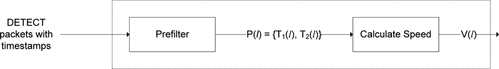 T-Sink-v node calculates the speed of vehicles with the help of two T-Sensor-v nodes (Figure 6). Whenever it receives a DETECT packet from each T-Sensor-v node, the Prefilter block filters out unbalanced packets which are received in reverse order or incomplete pairs. If Prefilter block matches the l-th pair of two DETECT packets from two T-Sensor-v node correctly, P(l) = {T1(l), T2(l)} is passed to the Calculate Speed block. Ti(l) denotes the DETECT packet reception time from the i-th T-Sensor-v node. The Calculate Speed block calculates the speed V(l) using (distance between two T-Sensor-v nodes)/|T1(l) − T2(l)|.