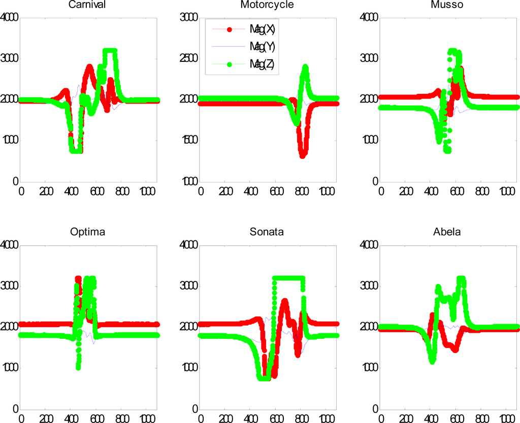 Magnetic Field distortion by different vehicles. Carnival is a kind of van, and Musso is a kind of SUV. The others are categorized as passenger cars.